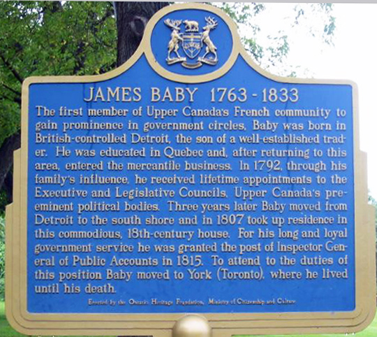 Baby's family had been renowned for its loyalty to the crown since the conquest(1760). After the division of the old province of Quebec in 1791 into Upper & Lower Canada, he became one of western Upper Canada's foremost office holders.
